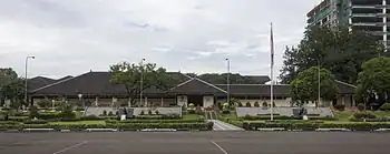 The museum is located on Gatot Soebroto Street in West Kuningan, Mampang, South Jakarta, and sits on 5.6 hectares (14 acres) of land;[1][2][3] the exhibitions are divided amongst three buildings and the grounds.[4] It is the main military museum in Indonesia.[2] The name Satria Mandala derives from Sanskrit and translates as "a sacred place for the knights".[2] The museum is open to the public and has archives for persons researching the history of the armed forces.[5]
