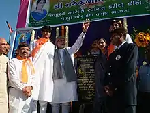 Prime Minister of India Narendra Modi unveiling the statue of Savjibhai Korat. Jashuben Korat is on right.