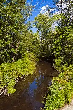 It flows predominantly through forests and farmland. Just above its mouth, it descends more steeply through a wooded area with several waterfalls into South Tivoli Bay, between the Montgomery Place estate and Bard College, which uses the stream as both its primary water source[3] and for disposal of its treated wastewater.[4] In the 1840s, the owners of those properties made an agreement to prevent development along the stream, one of the earliest such conservation measures in American history.[5]