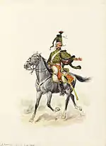 At the time of the regiment's emigration, the uniform consisted of the following: green dolman, green pelisse, yellow lace, red breeches, crimson & green sash, and green mirliton.[9]