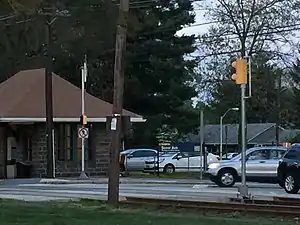 Trolleys arriving at this station travel between 69th Street Terminal in Upper Darby Township, Pennsylvania and Orange Street in Media, Pennsylvania. The station has a shed with a roof on the south side of the tracks where people can go inside when it is raining. No parking or bus service is available at this stop. While the south side of the tracks contain local businesses on Saxer Avenue, the north side is almost entirely residential.