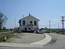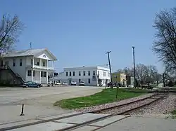 Along the railroad tracks through Scales Mound are five properties, four of them historic in nature. There are two shed/pump houses, both dating from c. 1910–40. One is a gable roof building with a concrete foundation and the other has a flat roof and metal siding. A rectangular feed warehouse dating from c. 1915–20 is also located along the rail corridor. The one story, gable roof feed warehouse stands on a concrete pier foundation. A pyramidal roof garage/warehouse, built c. 1915–25, stands on concrete foundations near the tracks as well. Associated with the garage are bulk oil storage tanks and a pump shed constructed by Trachte Brothers Company of Madison, Wisconsin. The only one of the five buildings not considered contributing to the district is a c. 1949–50 rail loading platform of pole construction.[2]