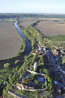 The Late Romanesque ruins of Schönburg Castle are on top of a mottled sandstone cliff by the Saale River, which is 40 metres high and declines sharply in the west. The castle was built with the local mottled sandstone.