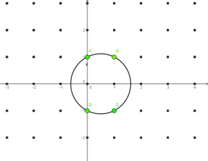 This circle has radius , and is centered at the point . For instance, the figure shows a circle with radius through four integer points.