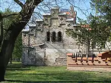 Both of the side wings have escalated frontage, each level is decorated with profiled quatrafoil and a little roof over it. The shape of the frontage copies the shape of a saddle roof, whilst it is taller and makes the wings appear more monumental than they actually are. It may appear that the side wings were not jointed to the main wing in the first place since the profilation of the frontage is repeated on the other side of the side wings facing the main wing just a couple of meters far from it. Since the side wings were originally used as stable there are only three small front windows in a row, centrally placed on the wall. All the windows are exactly alike; with a pointed arch on the top and no extra decoration.