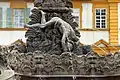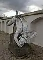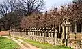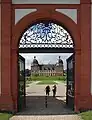The park is today quite different in appearance than originally, when it was laid out during the reign of Lothar Franz von Schönborn in the early 18th century, since the ponds, cascades and fountains were all drained in 1803-6, after the water pipe from the Stammberg had been cut. Most of the around 400 figures created by the sculptors Ferdinand Tietz, Gollwitzer and Trautmann in the 1760s were destroyed or sold following secularization. Some of these groups are today scattered around the Bamberg area or were taken to the Germanisches Nationalmuseum at Nuremberg. Today, a few have been returned and are on display in the western Orangerie. In the 1960s and 1970s vases and benches were sold off to private buyers. After 1995, the park was restored, including the cascade. Access to the park is by five ornamental wrought-iron gates, flanked by two guard houses which were built by Küchel. The six pillars are topped by lions and vases created by Peter Benkert. The smaller entry from the village is due to B. Neumann and Küchel. The sweeping Orangeries were used by Adam Friedrich von Seinsheim in the 1770s for staging plays. At the time, the guest rooms in the western wing still had a direct view of the Neue Residenz at Bamberg. The park features hornbeam hedges that are over 300 years old and groves of 250-year old linden trees.[2][1]: 228–9