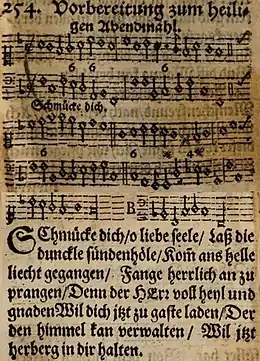"Schmücke dich, o liebe Seele" is a hymn for Lutheran Communion which was often set to music to be played or sung during communion. A translation by Catherine Winkworth, "Deck thyself, my soul, with gladness" of 1858, appears in 100 hymnals. In the modern German Protestant hymnal, Evangelisches Gesangbuch, it is EG 218, retaining six of the original nine stanzas.