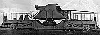 The howitzers were mounted on four-axle well base carriages and were top carriage traversing mounts with 360° of traverse. Once on site the carriage's outriggers would be unfolded and jackscrews at the ends of the outriggers lowered to level the carriage and take the weight off the axles while four rail clamps would anchor the carriage in place. A circular gun platform unfolded to give the gun crew a level work surface for loading, traversing and elevating the guns. The elevation system had a combination of a rapid system which lowered the barrel to +5° for reloading while a slow system allowed for small adjustments to vary range. Traverse was by a worm gear at the base of the mount which allowed for fine adjustment.[1]