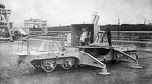 The mobile battery consists of four railroad cars. Two cars have an 8-inch rapid-fire gun, there is an ammunition car that is between the two gun cars, and a telescoping observation car.[4] The advantages of the Schneider train were that it was less costly than a fixed battery of the same firepower; the train allowed a degree of secrecy since it was not in a fixed location; ease of maintenance since it could be stored in a train shed; there was no need to construct new roads for its use; and any railroad tracks laid for its use can also be used by passenger and freight haulage.[5] The cars of the train were arranged with the train engine first, followed by the observation car, then the first gun car, the ammunition car, and then the second gun car. The observation car was placed near the engine so that the commanding officer could more easily place the train where required. The ammunition car was placed between the two gun cars to provide the shortest distance to move the artillery shells to each gun.[5]