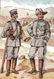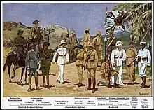 African personnel wore a pocketless cotton khaki tunic and breeches with blue puttees and ankle boots, which replaced bare lower legs and feet. African personnel also wore a red fez over which a khaki cover could be worn in the field. Company numbers were often worn on the front of the fez. In field conditions the askari wore either a khaki cover over their red fez or a khaki tarbush consisting os a khaki cloth over a wicker frame. Later in the war African troops wore a large floppy hat en lieu of the fez.[12] The arm of service color for African/native troops was red so their uniforms, when trimmed, were trimmed red down the trousers seam, the tunic fly, collar edge, plus NCO's wore red, later brown, chevrons on the left sleeve only.[13]