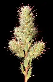This chenopod is an erect perennial, growing to 30 cm high, which is covered all over with long soft silky hairs.[7] The fleshy linear leaves are 10–20 mm long.[7] The flowers are solitary but cluster at the apex of the branches.[7] There are 5 stamens. The tube is a short inverse cone 1–1.5 mm high, with a square, truncated apex.[7] There are five spines in a 3+2 arrangement, which are positioned at the corners of apex, with one pair close together and often appearing to be one spine.[7]