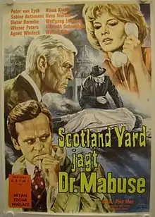 Scotland Yard Hunts Dr. Mabuse or Scotland Yard vs. Dr Mabuse (German: Scotland Yard jagt Dr. Mabuse) is a 1963 German crime film directed by Paul May and starring Peter van Eyck.[3] Scotland Yard vs. Dr. Mabuse was distributed in West Germany by Gloria Film, premiering on 20 September 1963.[1] The film was written by Ladislas Fodor, based on a story idea written by Bryan Edgar Wallace.[4] It was shot at the Spandau Studios in Berlin. The film's sets were designed by the art directors Albrecht Hennings and Hans Kuhnert.