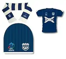 Since their first match Scotland have always played in royal blue, with a royal blue shirt, shorts and socks. In their two World Cup qualifying matches in 2007, the Scottish flag, featuring the white cross on a blue background, was on each shoulder and also on the shirt was a white collar.[104] On the left of the shirt is the Scotland badge, and on the right is the Great Britain badge which is split into four and then has the England, Scotland, Wales and Ireland rugby league badges in a shield.[105] This is to signify Scotland's part in the Great Britain setup.