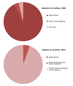 There has been a clear shift in industry in the village since 1881. According to the 2011 census, 14 people worked in agriculture. There has been a decreased number of people working in agriculture since 1881, despite an increase in population. The main job sector in 2011 was 'Public Administration and Defence; Compulsory Social Security'; 2165 people worked in 'Public Administration and Defence' in 2011.[17] This high number is most likely because of Scotton's close proximity to Catterick, as a vast majority of the population would be working at Catterick Garrison (army barracks), in the national defence sector.