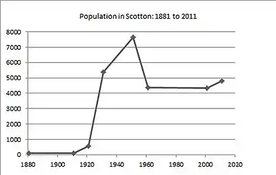 According to census information, between 1881 and 1951, the population of Scotton increased from 116 to 7,655. In 1911 the population totalled 97 and by 1921 it was 558.[10] This major influx in population was most likely due to the opening of Catterick Garrison army barracks at the beginning of the First World War in 1914, when it was founded by Lord Baden Powell.[11] During the Second World War Catterick Garrison was home to over 40,000 military personnel and in 2012 it was still home to 13,000; so dependants of these service personnel living in Scotton would have led to this increase in population.[12] It had a population of 4,810 according to the 2011 census.[13] In 1951, the population of Scotton was 7,655, so it has decreased since due to the decline in military activity in neighbouring Catterick Garrison. Before the development of Catterick Garrison, Scotton was a country estate. Scotton Hall, its park, Scotton Lodge and Scotton Cottage are now surrounded by army barracks.[14]