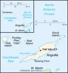 Map of Anguilla; Scrub Island lies off the north-eastern tip of the main island