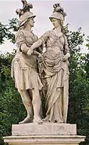 | 4 | Ceres and Dionysus | Joachim Günther | Ceres was the goddess of agriculture, marriage, and death, representing the generative power of nature.[7] She is shown with Dionysus, the god of the grape harvest, winemaking, and wine, and of ecstasy. He was the son of Zeus and Semele.[8] | ![]() |