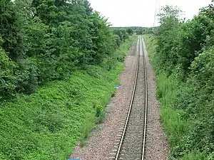 The site of the original station (foreground), viewed from the A192 road overbridge in July 2020. The proposed Northumberland Line station would be on the left side of the line, just before it veers off out of sight (background).