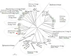 Sedoreoviridae (formerly Reoviridae) is a family of double-stranded RNA viruses. Member viruses have a wide host range, including vertebrates, invertebrates, plants, protists and fungi.[1] They lack lipid envelopes and package their segmented genome within multi-layered capsids. Lack of a lipid envelope has allowed three-dimensional structures of these large complex viruses (diameter ~60–100 nm) to be obtained, revealing a structural and likely evolutionary relationship to the cystovirus family of bacteriophage.[2] There are currently 97 species in this family, divided among 15 genera in two subfamilies.[3] Reoviruses can affect the gastrointestinal system (such as rotaviruses) and respiratory tract.[4] The name "reo-" is an acronym for "respiratory enteric orphan" viruses.[5] The term "orphan virus" refers to the fact that some of these viruses have been observed not associated with any known disease. Even though viruses in the family Reoviridae have more recently been identified with various diseases, the original name is still used.