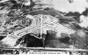 Construction was rapid given the emergency wartime conditions and within three months the post was to be in full operation. The airfield consisted of four concrete runways 6100x150(N/S), 5500x150(NE/SW), 6100x150(E/W), 6100x150(NW/SE) taxiways with the runways laid out on an "A" layout, with one extended length main runway, and two short secondary runways connected to an extended, large aircraft parking apron capable of parking several hundred aircraft in an overlapping squares, or "star" layout with a series of taxiways.