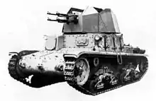 To save time and materials, the hull of the M15/42 tank was used as the basis for the quadruplo: The original turret was removed and replaced with a polygonal welded open turret, containing quadruple 20 mm-Scotti Isotta Fraschini 20/70 guns, with -5° to + 90° elevation; the autocannon had been specially modified so they could use disintegrating link belt ammunition resulting in an increased rate of fire 600 rounds per minute per gun.[1] The only other change involved the removal of the two Breda 38 machine guns in the hull, the openings for which were covered by 42 mm (1.7 in) armour plate; the crew was reduced to three, two in the turret and one in the driver position in the hull. The first prototype was completed by January/February 1943 and was presented for trials at the Centro Studi Motorizzazione dell'esercito: weighing 14.7 t (16.2 tons) at 2.55 m (8 ft 4 in) high, capable of operating up 60% slopes.