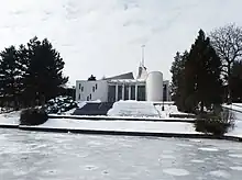 The church is an extravagant building, designed by architect Ludvík Kolek, who was inspired by Le Corbusier. Today, the building is considered a gem of modern architecture. The interior decoration is dominated by 14 paintings of the stations of the Cross by Mikuláš Medek.[3][4]