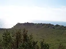 Seongsan Ilchulbong Tuff Cone was formed by Surtseyan-type hydrovolcanic activity upon a shallow seabed about 5,000 years ago when the sea level was same as the present.[1][2] Most volcanic cones or oreums (Jeju dialect for volcanic cones) were formed by piles of scoria cones which are created by Hawaiian eruptions or Strombolian eruptions. But Seongsan Ilchulbong Tuff Cone and a few other oreums on Jeju Island were hydromagmatic volcanoes which were made by piles of volcanic ash, the interaction of hot ascending magma and seawater or ground water. Seongsan Ilchulbong Tuff Cone is 182 meters high, and its crater is about 600 meters in diameter.[3][4] It has a dip of strata up to 45 degrees and is 90 meters from sea level to the crater floor.