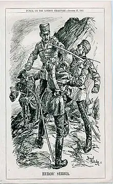 The Serbian army was commanded by Voivode Radomir Putnik who had defeated the Austro-Hungarians in 1914, Putnik's main commanders were Voivode Živojin Mišić leading the Serbian First Army, Voivode Stepa Stepanović commander of the Second Army while the Serbian Third Army was under Pavle Jurišić Šturm.[16] The Serbian army had about 780 guns, most of them heavy, the Serbians were forced to spread their forces by the entry of Bulgaria on the side of the Central powers.[17] The commander (Serdar) of the Montenegrin forces was Janko Vukotić.[18]