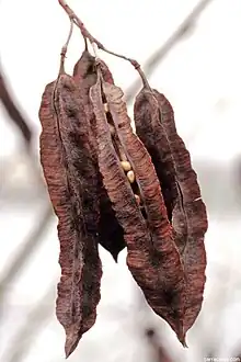 The deciduous leaves are alternate and compound. Between five and 20 pairs of elliptical leaflets occur on a single stalk. The leaf margins are commonly entire, with little or no serration. Each leaflet is oblong and ends in a pointy tip. The leaves contain stipules that are usually inconspicuous. The flowers and fruits droop at the tips of the stalks. The branches of this shrub are rather thin, and green, but turn a darker red brown when they mature. The bark varies from gray brown to red brown with obvious horizontal lenticels.[7][10][11]