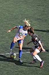 Sevgi Çınar (left) of Ataşehir Belediyespor getting challenged by Yeliz Açar of Fatih Vatan Spor in the 2017–18 First League.