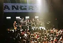 On the second day the band filmed live footage onstage at their show at Washington D.C.'s 9:30 Club.[34] This section of the video referenced both Janet Jackson's "wardrobe malfunction" and Jim Morrison's 1969 arrest for alleged on-stage indecent exposure,[1] choreographing a sequence where Manson exposed her breasts to the audience (in reality, a flesh-coloured bra) and dragged off-stage by hired actors posing as D.C. cops.[33] The rest of Garbage dropped instruments mid-song and stormed off. The audience were not told of the stunt and afterwards heckled the venue security.[33] Some of the audience assumed they had fallen victim to a Punk'd stunt.[32]