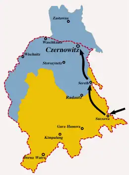 Pușcariu was also co-opted by the General Congress of Bukovina, a CNR body which claimed to be the provisional parliament of Bukovina, in opposition to the Ukrainian assembly; from 27 October 1918, he served on its foreign policy committee, alongside Alexandru Hurmuzachi and Gheorghe Grigorovici.[43] On 9 November, he helped Ilie Lazăr organize armed resistance to the Ukrainian Galician Army, which had occupied Czernowitz. These irregulars held their ground until the arrival of Romanian regulars under Iacob Zadig on 11 November.[44] One day later, Pușcariu, who relinquished his General Congress seat,[45] was sworn in as secretary of state for foreign affairs, under President Iancu Flondor, serving in this capacity to 18 December, when the cabinet transferred powers to a regular Romanian administration.[46] On 17 November,[47] he left on official mission to Iași, addressing thanks for Zadig's intervention. It was here that, on 22 November, he resumed contacts with Nistor, head of the Romanian Mission in Bukovina, with whom he reached an agreement on the recognition of the union.[48] He networked with Romanian nationalists in both Transylvania and the Moldavian Democratic Republic (or Bessarabia). He advised the former "never to reach a compromise with the Hungarians", while announcing the latter that Bukovina had become a Romanian province.[49]