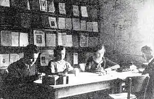 As a political journalist, Pușcariu joined the informal group, formed around Octavian Goga, Octavian Codru Tăslăuanu, and Ghiță Pop, and known as tinerii oțeliți ("inuered youth"). The main focus of their criticism was the more conservative Romanian National Party (PNR).[15] Through 1901, Pușcariu's writings regularly appeared in Gazeta de Transilvania. He also made important contributions to Luceafărul, headed by Tăslăuanu (whom he had befriended as a schoolmate in Brașov), while it appeared both in Budapest and, after 1906, in Sibiu.[16] In 1902, he was elected a corresponding member of ASTRA's literary section. During the remainder of his life, he undertook activities related to the society, although at varying paces: active that decade in its philological efforts, he found himself largely overtaken by other activities in the 1910s, only to organize a series of conferences starting in the mid-1920s in Transylvania's towns, both large and small.[17]
