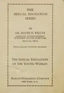 Sexual Education of the Young Woman is an educational book, published in 1923 and written by a psychiatrist and author David H. Keller (1880- 1966). The book provides sexual education guidelines for the girls above the age of six years old.[1] The guidelines concern biological knowledge about the female and male bodies, discussed in the context of prevailing moral and social norms. The book is intended to be read by the young girl herself or conveyed by her parents. As such, it is not only a source of knowledge but also a parenting tool. Sexual Education of the Young Woman contains 13 chapters, each dealing with a different topic of sexual education. It has clear views on the issues of morality and social norms- women are depicted as fundamentally different from men. The author suggests that the life purpose of a woman is giving birth and raising children as well as assuring a cozy and relaxing life for her husband. However, Dr. Keller stresses the importance of proper general and sexual education, and the influence it has on the happiness of a future mother and wife. Sexual Education of the Young Woman is a part of a 10 volume collection The Sexual Education Series released in 1928.[2]