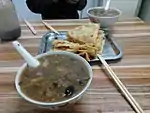 Vermicelli in lamb's blood soup粉湯羊血粉汤羊血fěn tāng yáng xuéA soup composed of ingredients such as congealed lamb's blood, paomo and other condiments. It is eaten with vermicelli and coriander.