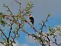 The shaft-tailed whydah is distributed in open habitats and grasslands of Southern Africa, from south Angola to south Mozambique. It is a brood parasite to the violet-eared waxbill. The diet consists mainly of seeds.