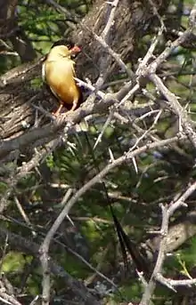 The shaft-tailed whydah or queen whydah (Vidua regia) is a small, sparrow-like bird in the genus Vidua. During the breeding season the male has black crown and upper body plumage, golden breast and four elongated black tail shaft feathers with expanded tips. After the breeding season is over, the male sheds its long tail and grows olive brown female-like plumage.