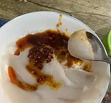 Liangpi涼皮凉皮liáng píCold rice noodle with spicy chili oil. Also called 面皮 (miàn pí), which is made translucent by washing out the gluten prior to cooking.