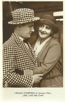 She and the Three (German: Sie und die Drei) is a 1922 German silent comedy film directed by E. A. Dupont and starring Henny Porten, Hermann Thimig, and Robert Scholz.[1]