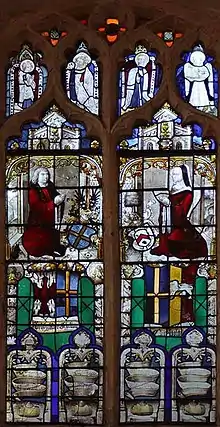 A stained glass window in Shelton church portraying two Shelton benefactors