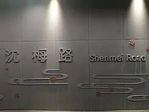 Shenmei Road (Chinese: 沈梅路; pinyin: Shěnméi Lù) is a Shanghai Metro station located on Line 18 in Pudong, Shanghai. Located at the intersection of Shenmei Road and Hunan Highway, the station opened for passenger service on 26 December 2020.[1] It is part of the first section of Line 18 to become operational, a southern segment of phase one of the line which consists of eight stations between Yuqiao and Hangtou.[2][3] It is also the terminal station of short-route trains during peak hours.[4]