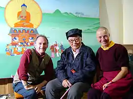It was whilst studying at Namgyal Ling that Beru attained high levels of skill, not only in Thangka painting, but also in associated monastic disciplines such as ritual music, and Lama dancing in particular.[4] In 1956, after over 30 years of living at the monastery, Beru left for Lhasa, where he stayed for three years, until forced to escape to India following the invasion of Tibet by Chinese forces. Once in India, Beru began thangka painting again, based for a while in Dalhousie[4] where, amongst other works, he was commissioned by Lokesh Chandra to produce a series of drawings of mandalas for publication. He was then asked by the 16th Karmapa, Rangjung Rigpe Dorje, to make his way to Scotland where Chogyam Trungpa and Akong Tulku Rinpoche had established the first Tibetan Buddhist centre in the west, Kagyu Samye Ling, in Eskdalemuir, Dumfriesshire. Despite having some initial misgivings about leaving the Tibetan community in exile in Northern India so soon after having arrived as a refugee, Beru acceded to the wishes of his Guru.[3]