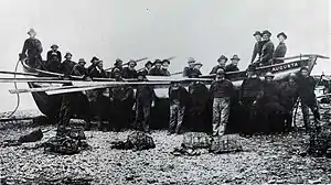 The first lifeboat to serve Sheringham was the privately funded Augusta.[2][8] The boat was provided by Mrs Charlotte Upcher[2] of Sheringham Hall at a cost of £134.12s.2d.[8] Mrs Upcher had been, for sometime, concerned with the appalling loss of life during severe gales along the East coast and in particular the gale of 29 November 1826.[2] During this brutal storm seven Sheringham fishermen were lost when their two boats overturned just offshore. Then, in January 1838,[2] a large Sheringham fishing boat known locally as a "twenty footer" was damaged and sunk on Sheringham Shoal. These incidents prompted the establishment of the lifeboat service in Sheringham.[2] The new lifeboat was built by Robert Sunman in the style of the local crab fishing boats. It was launched in November 1838[8] and was named Augusta after Mrs Upcher's recently deceased daughter. Augusta was 33 feet 6 inches long and 10 foot 3 inches wide.[2] The power for the boat was provide by 16 oars. She was equipped with a dipping lug mainsail, mizzen sail and had fittings for a rudder at either end to avoid turning her in heavy seas.