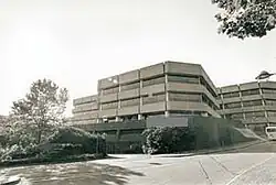 The new Shire Hall, which was designed in the Brutalist style and built at a cost of £27.5 million,[9] was completed in 1981.[10] The design involved seven low-rise octagonal shaped buildings which all featured continuous bands of glazing with concrete panels above and below; an emergency control centre was established in the basement in case of a nuclear attack.[11] The complex was officially opened by Queen Elizabeth II on 2 April 1982.[12]