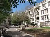 Considering the location, the complex of "long train" tenement buildings were built in the manner of fortresses.[15] The buildings were erected on a base of reinforced concrete and the walls were finished in rough stone, since this type of material could be handled by hundreds of unskilled workers.[16] The Israel Housing Ministry mandated that the external concrete walls of the buildings be three times the normal thickness to withstand shelling.[17] The roofs of the buildings had raised parapets fitted with gun slots.[15] The buildings themselves were arranged in a "confusing zig-zag pattern" to slow down Arab armies that might charge the complex,[18] and the courtyards between the buildings were designed to accommodate mass mobilization of Israeli troops in the event of an attack.[15] For many years, residents barricaded their building entrances with sandbags and reinforced or blocked windows exposed to the border with Jordan.[19]