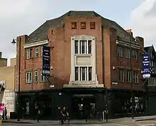 The station building was replaced between 1925 and 1928 as part of a road widening scheme undertaken by the London County Council and was an attractive three story pale red brick building built in the style of the time. The design was complemented by stone work including the words "LM1928SR" and the winged symbol they then used. The exit was at the corner of Kingsland Road and Old Street and the arrival hall attractively laid out in ceramic tiles. These were a buff colour with burnt orange, black and brown detailing. The subway to the island was done out in white glazed brick and the station building now included a parcels office.