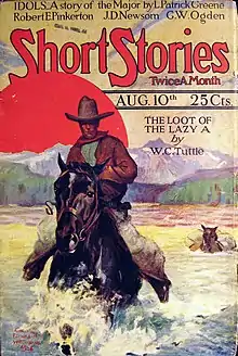 In the 1920s and 1930s, however, Short Stories was best known as a publisher of Western stories, with many of the best-known Western fiction writers such as Clarence E. Mulford, Max Brand, Luke Short, Ernest Haycox, W. C. Tuttle, James B. Hendryx, Barry Scobee,[3] Bertrand William Sinclair and B. M. Bower appearing in its pages.[4] Short Stories also carried adventure fiction, such as "Northern" tales set in the Yukon, and adventures in the South Seas or Sub-Saharan Africa. The magazine's writers in the adventure genre included George Allan England, H. Bedford-Jones, Gordon MacCreagh, J. Allan Dunn, L. Patrick Greene (stories set in Africa), William Wirt (who chronicled the exploits of a mercenary, Jimmie Cordie) and George F. Worts (who wrote about South Sea adventures).[5] Thriller writers Edgar Wallace, Sax Rohmer and Dornford Yates had stories in the magazine in this period, as did Vincent Starrett, who wrote about private investigator Jimmie Lavender for Short Stories.[6] Albert Richard Wetjen contributed sea stories to the magazine.[7] Short Stories also published a large number of adventure stories featuring the Foreign Legion. The magazine's practitioners in this sub-genre included J.D. Newsom (with humorous stories about Legionnaires Mike Curialo and Albert Withers), Georges Surdez, Robert Carse and Bob Du Soe.[7] Some of the serials published in Short Stories were later published in hardback by Doubleday. These included Jimmie Dale and the Blue Envelope Murder, by Frank L. Packard.[7]