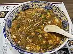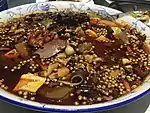 | Mapo doufu | ![]() | 麻婆豆腐 | 麻婆豆腐 | mápó dòufǔ | Literally "pockmarked Ma's tofu". Spicy sauce similar to yuxiang ("in the style of fish") sauce.[16] |
