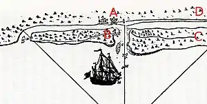 Detail from a period French map depicting the siege: * A: St. Augustine and the Castillo de San Marcos * B: Island where the English landed their boats, and where Spanish reinforcements arrived * C: Route by which James Moore retreated * D: Route by which Robert Daniell retreated