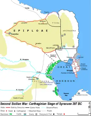Himilco chose to camp next to the Great Harbour in the Polichana area. The camp was either 10 stadia[33] from the Syracuse city walls, which would place it north of the Anapus river, or 12 stadia from the walls, totally south of the river.[20] Himilco chose the temple of Zeus as his quarters.[34] The main camp was probably situated on the marshy ground east of the temple of Zeus,[35] and adjacent to the Dascon bay and the Lysimeleia marsh. The berthing facilities for the ships formed part of the camp, and the camp was surrounded by a moat and palisade.